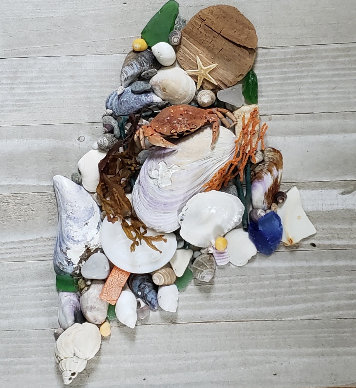 12″ x 12″ State of Maine. Every piece is one-of-a-kind and made from treasures I have found on my favorite Maine beaches. These pieces include a list of items to “find” that can be fun for kids and adults. $98 ea