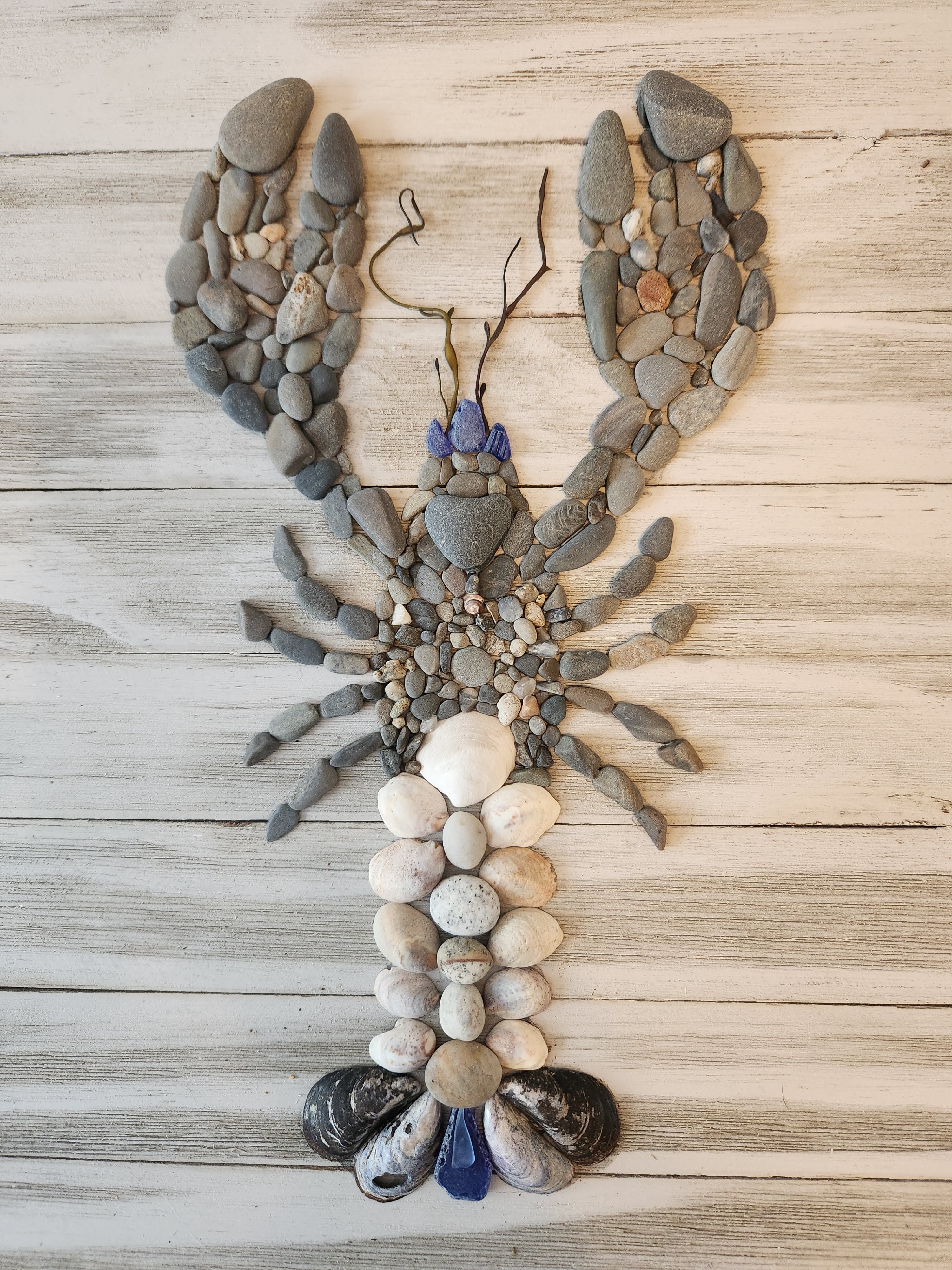 Custom signs made with Maine beach stones, sea glass, shells and other “treasures” I have found on the beach. Contact me for pricing. I have done Welcome, Home, and I love U (with sea glass heart). The Welcome sign pictured is 36″w x 6″h and hangs in our entryway. Prices range from $65 to $115.