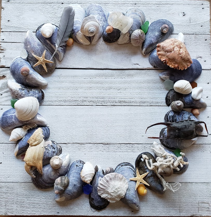 12″ x 12″ Maine Welcome wreaths. Made from Maine beach treasures. Mussel shell wreaths (above left) $45, Oyster shell wreaths (above right) $38